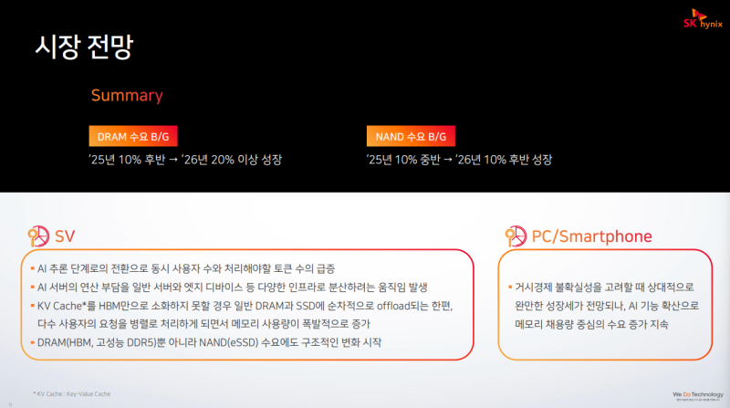 • 올해 메모리 시장은 관세 등 대외 불확실성이 있었으나 글로벌 AI 인프라 투자가 확대되며 HBM뿐 아니라 일반 서버향 디램과 엔터프라이즈 SSD까지 수요가 증가하는 흐름