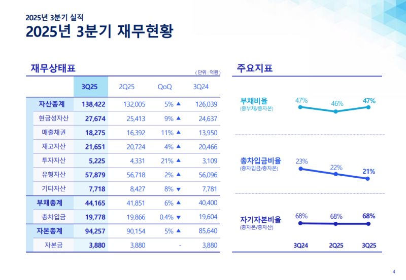 • 3분기 말 자산총계는 13조 8422억 원으로 전분기 대비 5% 증가