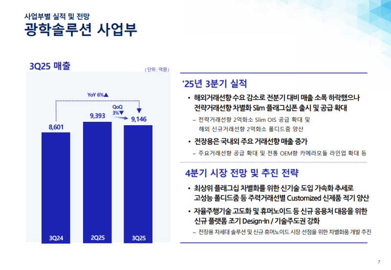 • 전장용 카메라 모듈은 3분기 주요 국내 고객향으로 하이브리드 렌즈 양산 공급을 시작하며 제품 라인업 확대