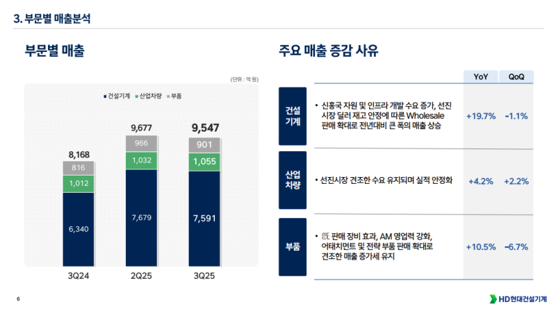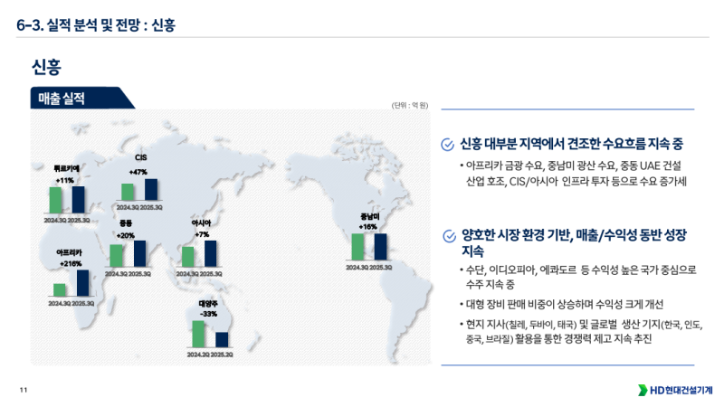 • 신흥국 자원 및 인프라 개발 수요 증가와 선진시장 딜러 재고 안정에 따른 홀세일 판매 확대 영향으로 전년 동기 대비 19.7% 성장 기록