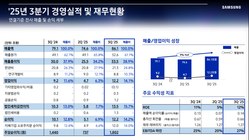 • 매출 86.1조원(QoQ +15.4%, YoY +9%) 기록