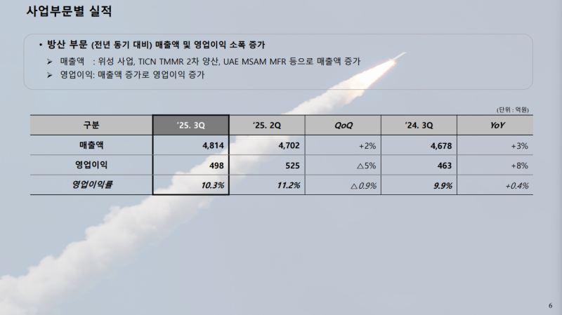 • 2025년 연간 기준 방산 부문 매출과 영업이익은 전년 대비 10% 이상 성장 예상