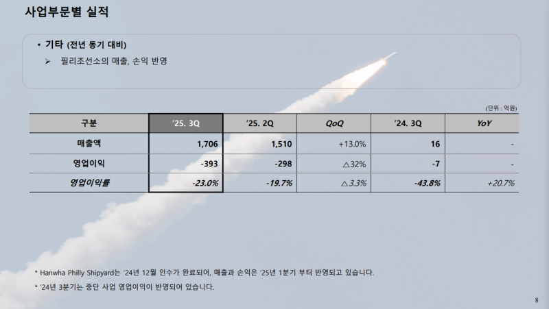 • 3분기 한화필리조선소 매출은 약 1,684억 원, 손실은 약 390억 원