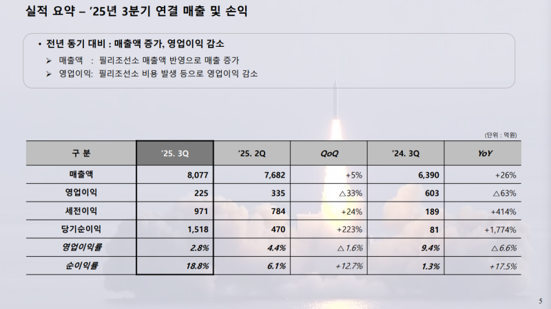 • 매출액: 8,077억 원 (QoQ +5%, YoY +26%)