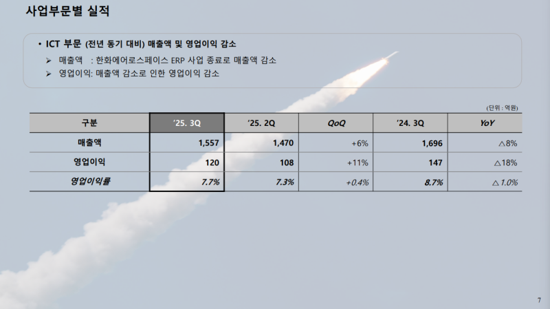 • 전년 동기 대비 매출은 한화에어로스페이스 ERP 사업 종료 영향으로 감소