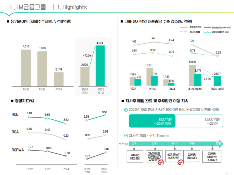 • 그룹 3분기 누적 순이익 : 4,317억 원 (YoY +70.9%), 전사적 충당금 감소와 은행 중심 실적 개선이 주 요인
