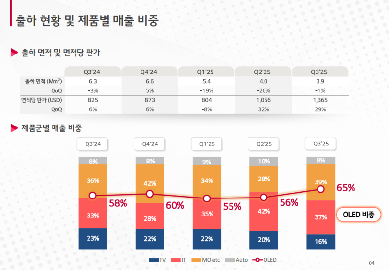 • 전체 매출 내 OLED 제품군 비중은 전분기 대비 9%p, 전년 동기 대비 7%p 상승한 65%로 확대