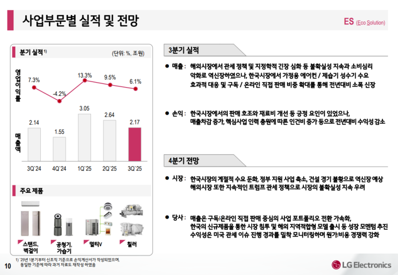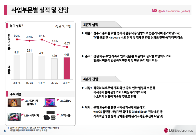 • 성수기 대응을 위한 선제적 물류 활동 영향으로 전분기 대비 매출은 증가했으나, TV를 포함한 하드웨어 수요 정체와 경쟁 심화로 전년 대비 감소