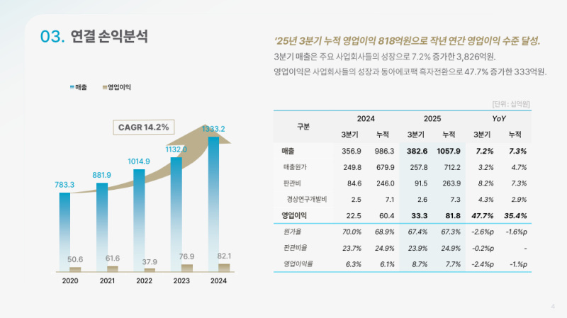 • 2025년 3분기 연결매출 3,824억 원 (YoY +7.1%), 영업이익 333억 원 (YoY +47.7%)