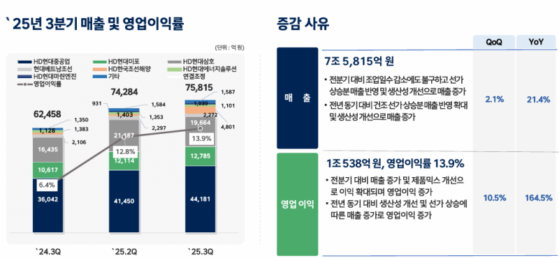 • 매출 7조 5,815억 원(+21.4%), 영업이익 1조 538억 원(이익률 13.9%, +164.5%)