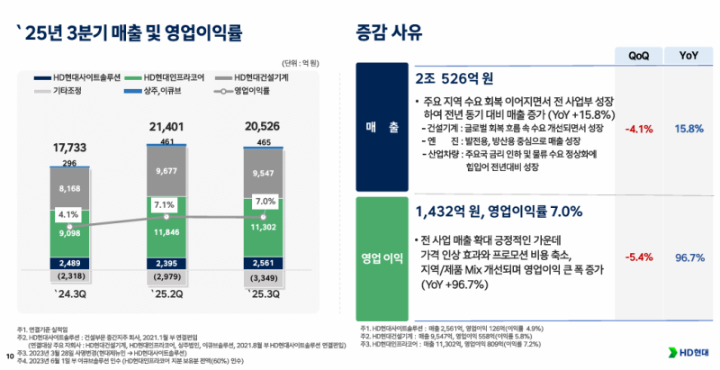 • 영업이익 1.7조 원(+294.5% YoY, +49.5% QoQ)을 기록. 정유 부문 흑자 전환 및 조선·전력기기 수익성 개선이 실적 개선 견인