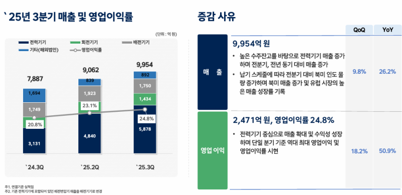 • 매출 9,954억 원(+10% QoQ, +26% YoY), 영업이익 2,471억 원(+18% QoQ, +51% YoY)