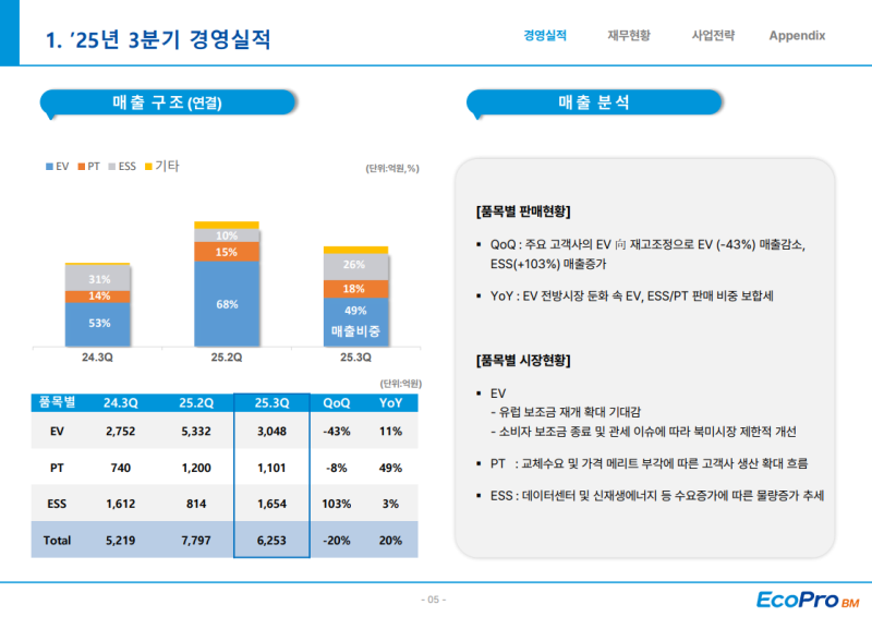• 유럽 고객사 재고조정 영향으로 EV향 출하량은 21% 감소했지만 ESS향 매출은 103% 급증