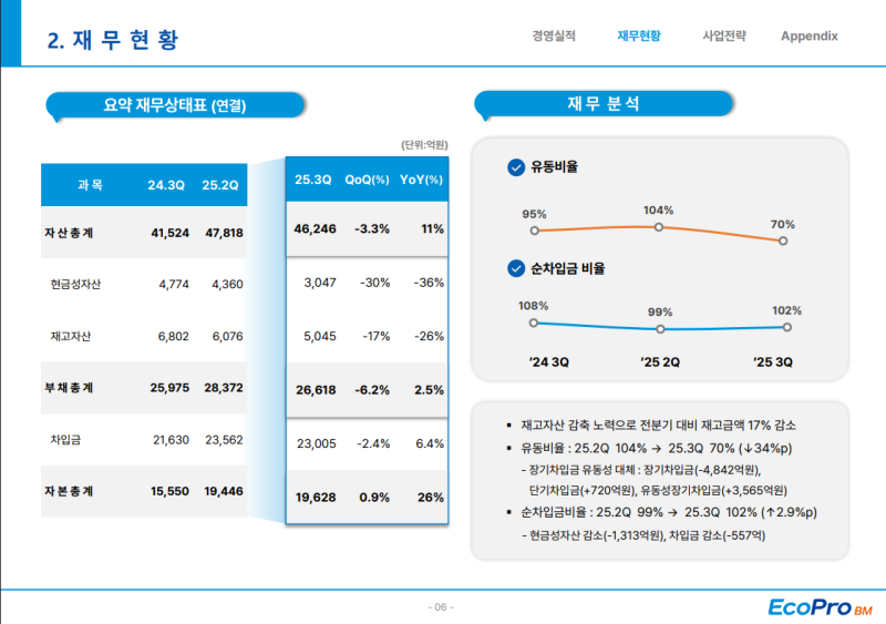 • 헝가리 공장 설비 잔금 지급 및 차입금 상환으로 현금성 자산이 감소하며 순차입금 비율은 전분기 99%에서 102%로 상승