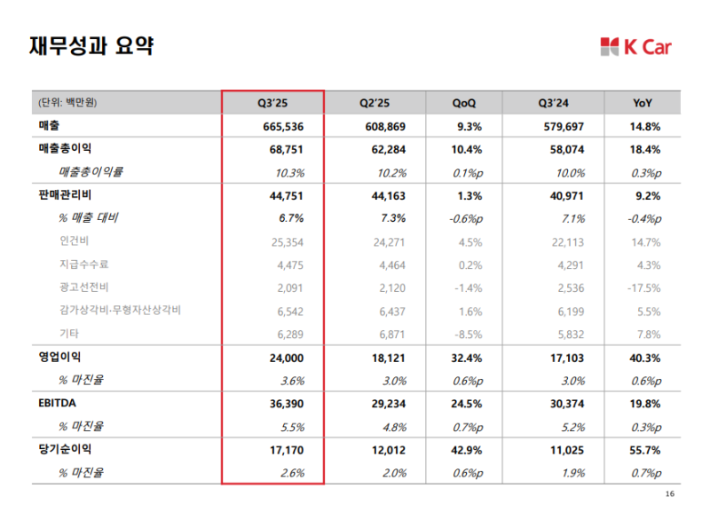 • 매출 6655억 원 (YoY +14.8%, QoQ +9.3%)으로 3개 분기 연속 최고 실적