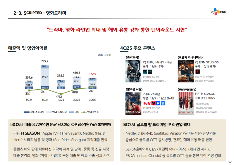 4분기에는 ‘태풍상사’, ‘프로보노’ 등 주요 신작과 글로벌 OTT 확장이 실적 개선을 이끌 전망