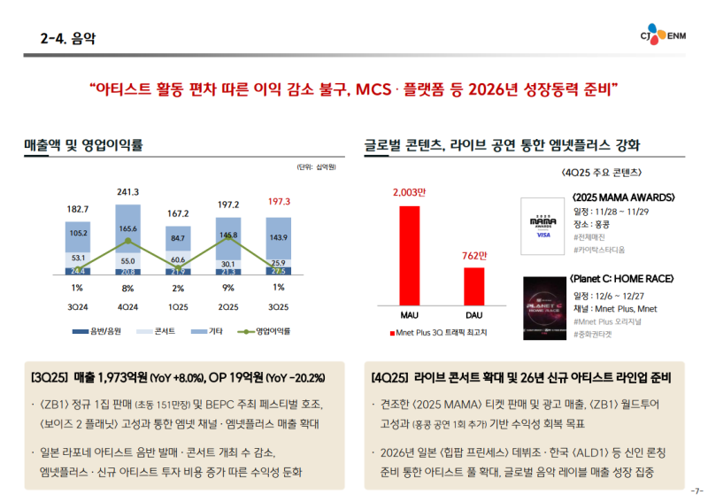 • 3분기 이익은 미디어 플랫폼 부문 턴어라운드와 음악 부문 아티스트 활동 시기 차이로 2분기 대비 감소