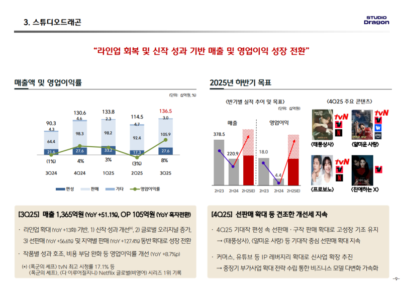 스튜디오드래곤 2025년 3분기 실적 요약