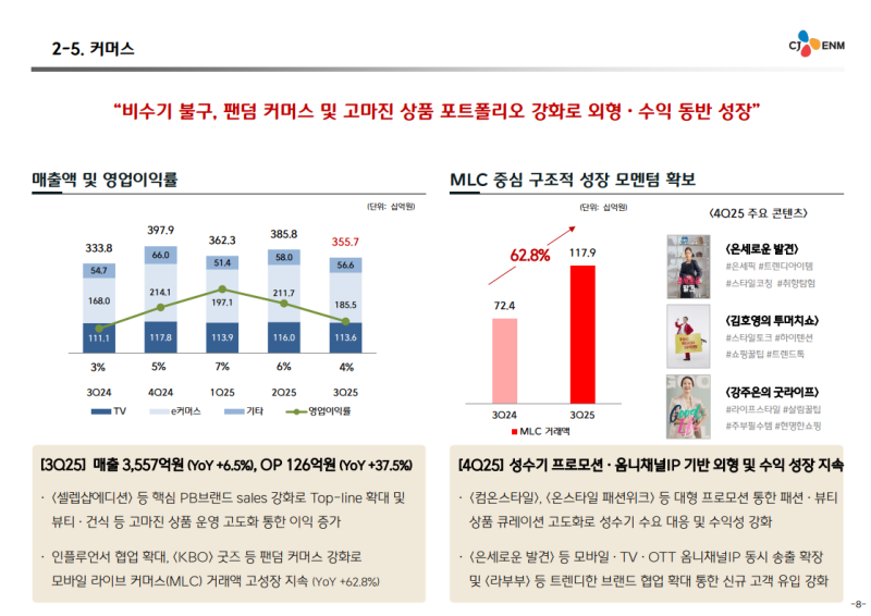 • 엔터 사업은 TV 광고 부진으로 영업이익 감소, 커머스는 모바일 라이브 커머스 확대 및 고마진 상품 강화로 수익성 개선