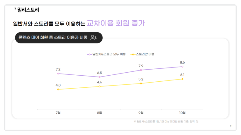 • 스토리 이용자들은 시대·트렌드에 맞는 일반서를 찾아보는 성향이 있어 교차 이용이 증가하면 스토리 기반 헤비 유저의 신규 유입과 함께 일반서 이용 확대로 연결될 가능성이 있어 중요한 지표로 인식