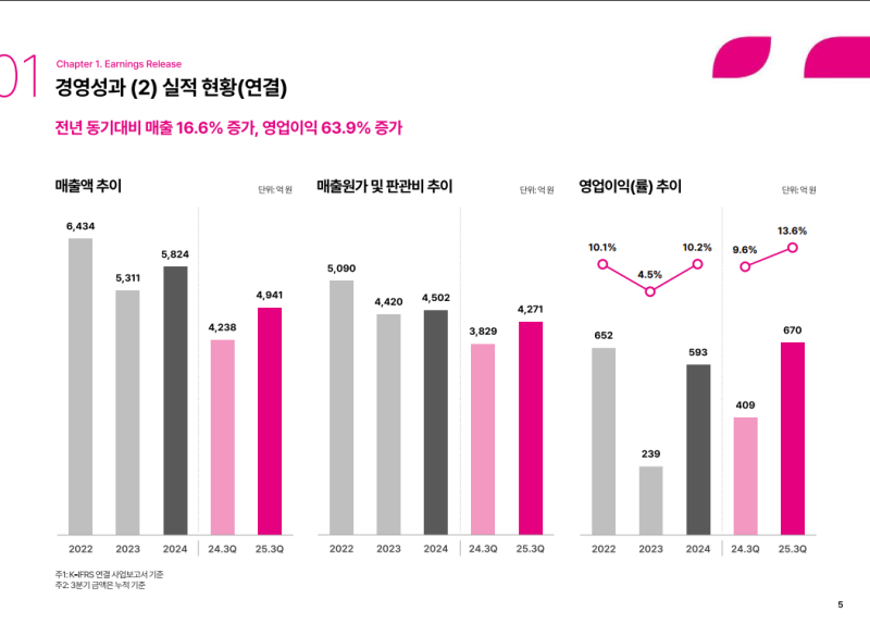 • 연결 영업이익 : 670억 원(YoY +63.9 %, 영업이익률 13.6 %)