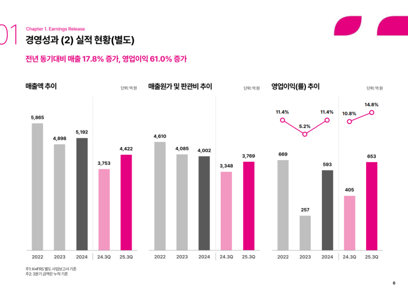 • 별도 영업이익 : 653억 원(YoY +61 %, 영업이익률 14.8 %)