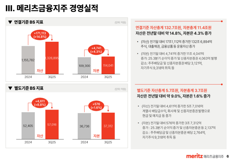 • 지주의 25년 3분기 연결 자산은 운용자산 증가로 전년말 대비 14.8 % 증가한 132.7조원 기록
