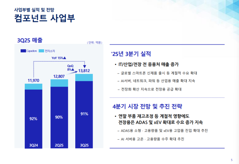 환율 우호와 비용 절감으로 4Q 영업이익은 약 2,300억원 수준으로 상향 FCBGA는 AI·서버 수요로 2027년까지 풀가동이 예상되며 MLCC는 IT 의존도가 추가로 낮아지고 전장·AI 비중이 확대되는 구조